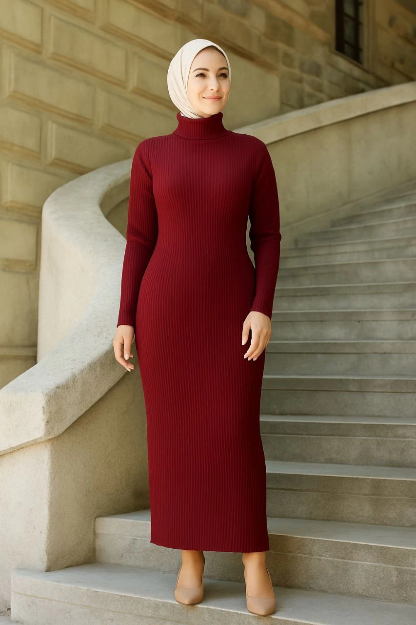 Sofanest Kadın Boğazlı Uzun Fitilli Tesettüre Uygun Triko Dokuma Elbise - Bordo