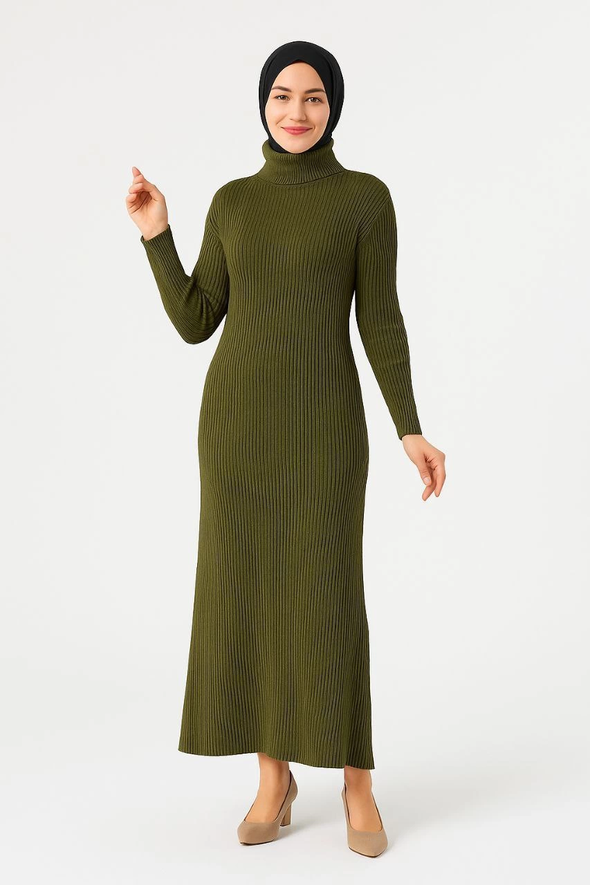 Sofanest Kadın Boğazlı Uzun Fitilli Tesettüre Uygun Triko Dokuma Elbise - Haki
