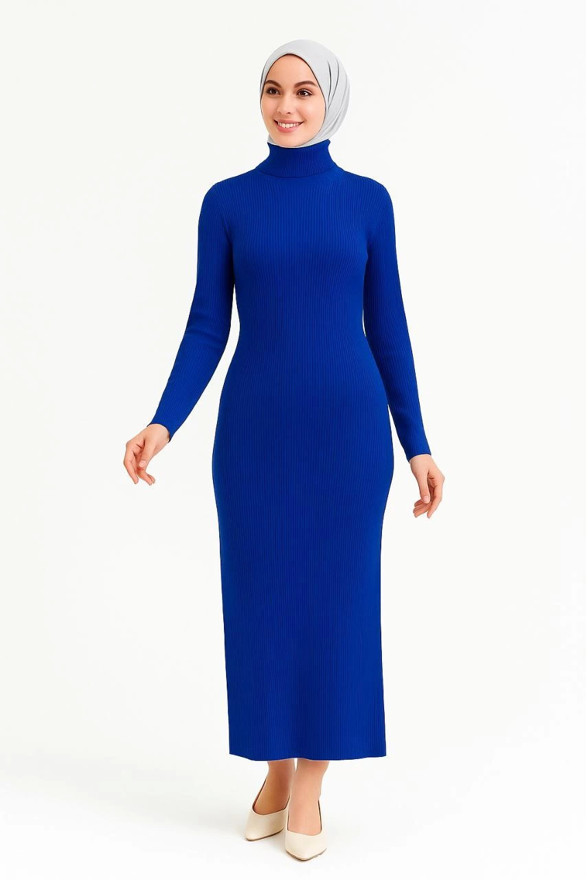 Sofanest Kadın Boğazlı Uzun Fitilli Tesettüre Uygun Triko Dokuma Elbise - Saks Mavisi