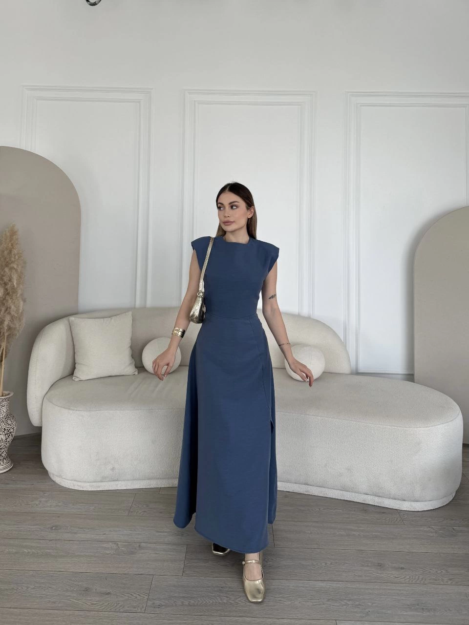 Sofanest Keten Yandan Yırtmaçlı Uzun Elbise Sıfır Kol Elbise - Mavi