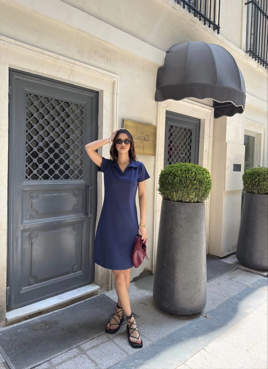 Sofanest Osy Modal Yumuşak Dokulu Kumaş Yakalı Kısa Kollu Elbise - Mavi